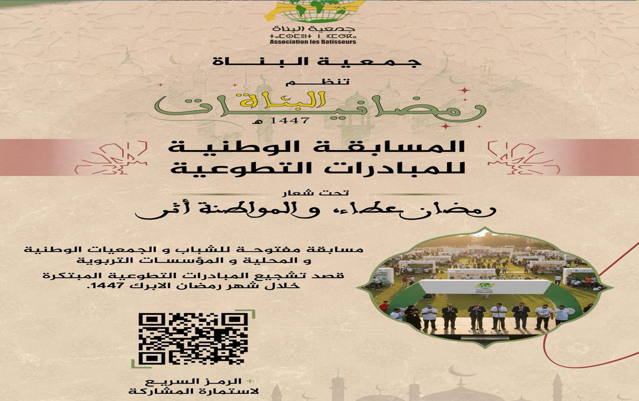 في إطار دعمها لدينامية العمل المدني، أعلنت جمعية “البناة” عن إطلاق مسابقة وطنية للمبادرات التطوعية بمناسبة شهر رمضان 1447 هـ، واضعة نصب أعينها تشجيع الشباب على تحويل أفكارهم إلى مشاريع ميدانية ذات أثر ملموس.
